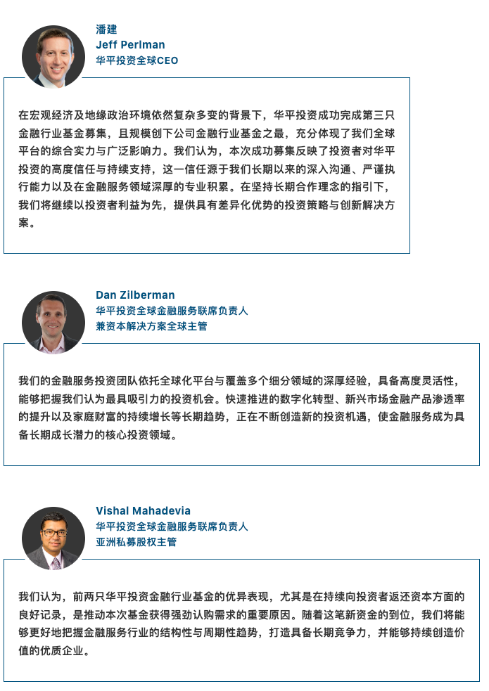 华平投资的金融服务投资业务是一体化的全球平台,拥有40余名专业投资人士,是业内规模领先的专注全球金融服务领域的投资团队之一。 华平投资金融行业基金三期的成功募集,延续了华平投资近期多只全球旗舰基金的良好势头。此前,华平投资全球成长基金第十四期(Warburg Pincus Global Growth 14)完成173亿美元募集,超出160亿美元的初始目标规模;华平投资资本解决方案基金(WPCS FF)亦成功募集40亿美元,较其20亿美元的初始目标实现大幅超募。